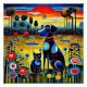 A.I. assisted print of a vibrant scene depicts a stylized dog and cat seated together among a surreal landscape and exaggerated floral designs, whimsical, colourful plants, beneath a striking sunset with bold colours and geometric patterns.