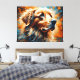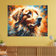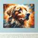 A vibrant portrait captures the expression of a golden retriever with a gaze directed off to the side. The colors are bold and expressive, contrasting warm oranges and cool blues, which add dynamic to the dog's fur and background.