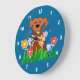 Dog decor and wall clocks. Cute dog wall clock with picture of a brown doggie in a pretty colorful flower garden. Hang your personality on the wall with these unique wall clocks for bedroom, living room, family room, kitchen, bathroom or the office. Our clocks are a great way to put a personal touch to your home decorating.