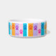 This is a heavy, durable bowl decorated with Tibbies of many colors, the perfect size for hungry/thirsty Tibs. The design is interesting and printing clear.