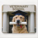A golden retriever wears a graduation cap and holds a diploma in its mouth, standing in front of a building labelled "Veterinarian School"