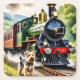 A nostalgic scene of a dog greeting the arrival of a green steam train.