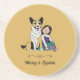 This yellow-dominant coaster features an illustration of a young woman and a happy large breed dog leaning against each other. This is a great gift for a young female who owns a dog or who loves dogs in general.