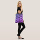 A pattern of black paw prints adorn this tote bag. This grocery or shopping bag features a blue and purple abstract pattern background. Small black paw prints appear around the entire tote.
