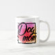 Cute coffee mug for any dog lover featuring the wording "Dog mum" in modern black lettering over a colourful watercolor splashes background and decorated with lovely paw prints.