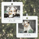 This simple and elegant square Christmas ornament is a sweet way to celebrate your puppy or pet’s first holiday season. The design features space for one photo on the front and one on the back, making it a double-sided keepsake filled with adorable memories. "My First Christmas" is displayed underneath the front photo in a classic serif font, with your pet’s name written below in soft script for a personal touch. If you’re celebrating more than one pet, you can easily change the wording to say "Our First Christmas" instead.