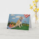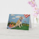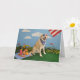 This is a photo of a dog on a picnic wearing patriotic sunglasses. American flag hangs. Inside message: Pizza, burgers, beans 'n beer.........summer time is finally here! Could be a 4th of July card.