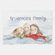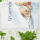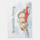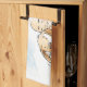 This kitchen towel has an illustration of a cute puppy and its parents, a bald man and a brunette woman. You can customise the text.