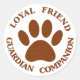 A dog paw print with distressed effect. Text and and drawing in brown.