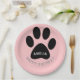 Dog Paw Print Pink Birthday Party Paper Plate. The design features a Happy birthday text, a name in a black dog paw print on a pink background. Personalise the plates with your name. You can change or erase the text Happy birthday.