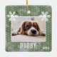 Dog Photo Snowflakes Green Pet Name Christmas Ceramic Ornament. Cute and festive design with a custom photo and name. The background is green with white snowflakes. Add your photo and name and make a lovely photo keepsake for a dog or any other pet.