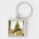 dog posing in front of Christmas tree Key Ring