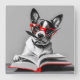 Black and White Picture of a dog Reading a read with a colour splash of red glass frame a book cover