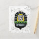 Funny dog mixed media collage with black and white arch, shapes, along with yellow and green accents, all over a textured white background.