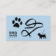 A blue business card with illustration of a paw, a leash, and a silhouette of a dog for dog walker activities or other pet services such as groomer, animal behaviorist, etc. It is fully customisable and hope will help you in your business.