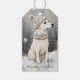 cosy dog in a knit hat and scarf in the winter snow. The front reads Warmest Wishes, and the back includes To and From lines for easy gifting. The taupe and ivory palette pairs well with linen ribbons and kraft paper for a warm, understated finish.
