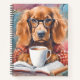 Dog with a cup of hot chocolate, or maybe coffee, and an open book ready to read