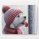A fluffy white dog in a red knit hat and scarf has its tongue stuck to a frosty metal pole
