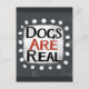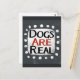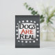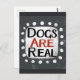 "Dogs Are Real" is a cute text design in grey with black and red text, along with a white accent shape and white textured whimsical dots surrounding it.