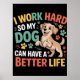 This heartfelt graphic features a joyful, light brown cartoon dog, energetically mid-stride, surrounded by colourful paw prints. The bold text in varying colours proudly states, "I WORK HARD SO MY DOG CAN HAVE A BETTER LIFE," expressing a common sentiment among devoted pet owners. The design is set against a solid black background, making the message pop. Digital download for personal use only.