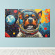 This vibrant artwork presents a captivating close-up of a dog's face, framed within the clear visor of an astronaut's helmet. Rendered with bold, textured strokes in a dynamic palette of oranges, blues, and reds, the canine's expressive gaze meets the viewer. The background unfolds into a stylized cosmic expanse, featuring distant planets and scattered nebulae-like formations, all rendered with a tactile, almost impasto effect. The intricate detailing of the fur and helmet contrasts with the energetic, abstract elements of the surrounding space, creating a striking visual narrative.