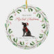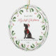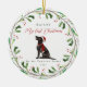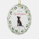 This sweet dog ornament features "my first Christmas in my forever home" typography with pretty red script. Your pet's name is prominent at the top of the design, and is surrounded by a festive botanical and berry painted wreath. The ornament includes a cute pointer black illustrated dog in the centre. A beautiful gift for any fur parent!
