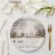 This scenic snow landscape picture on these original paper plates has a painting of two dogs adorning them one of the dogs was named Tod, he was a mixed breed German shepherd/labrador brown dog and the other dog was Eddie a mixed breed black and tan German shepherd/collie dog. The two best friends were painted from a photograph was taken when they were having a good sniff in the snow covered woodland landscape. The original image is a watercolour painting of a beautiful open woodland area in London called Pole hill, it always looks really festive when it's under a blanket of snow, and in the background, through the snow covered trees, you can see the snow rooftops of the houses under a covering of snow. Tod and Eddie were best friends and they did everything together, Tod was severely epileptic and when Tod had a seizure coming on Eddie would find me and take me to, I could then make sure I was close by Tods side during the seizure. Sadly Tod and Eddie are no longer with us, but this little winter wonderland snow painting depicts happy times. These are customisable christmas plates, you can personalise them with your own text. The original painting of this snow scene is in water-colour. This image has been digitally enhanced to give it a sepia effect.