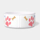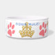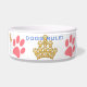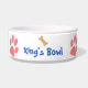 We know who rules the house - This large Dog Bowl features an original illustration by ZoeSPEAK of a golden crown made of dog bones and paw prints. There are also four pink dog paw prints around the white bowl, and the words "DOGS RULE!" in blue. Centred between two of the paw prints is text in blue which reads "King's Bowl". This is set to personalise with your dog's name or anything else you like.
