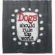 A cute typographic design that says "Dogs Should Rule The World". It's black and red text on a white rectangle with funky, playful dots surrounding it sits on a solid, textured grey background.
