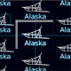 A white silhouette of a dogsled on a starfield background. "Alaska" appears in glowing blue and white.