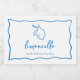 This beautiful Italian inspired limoncello label design features green handwritten style cursive lettering accented with a wavy scribble ribbon border in Mediterranean blue. A hand drawn illustration of a Sicilian lemon completes the design for a summery Amalfi Coast look. These elegant Mediterranean bridal shower lemoncello favour labels feature two lines of custom text in hand lettered script and classic serif lettering.