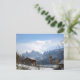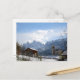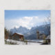 Postcard with snow on the church of St. Jakob with a Dolomites background in the Val di Funes in South Tyrol, Italy in winter.