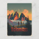 A captivating and nostalgic depiction of hiking in the Dolomites, Italy, showcasing the rugged beauty and dramatic landscapes of the mountain range. The design features hikers traversing scenic trails amidst towering peaks, lush meadows, and alpine lakes. Rendered in a vintage style, the artwork evokes the adventurous and serene experience of exploring the Dolomites, inviting viewers to immerse themselves in its breathtaking natural splendour