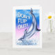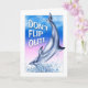 The card's image is of a dolphin doing a flip with the caption "Don't flip out!". Inside text: "It's only a birthday! Hope it's a happy one" The back of the card lists fun facts about dolphins.