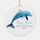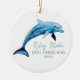 Baby girl or boy's first Christmas ceramic ornament with a minimal dolphin illustration. Personalised with the baby's name and the year. Double-sided design. Ideal newborn keepsake for the Holidays.