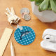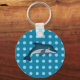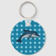 This keychain features an illustration of a dolphin. The dolphin is on top of a blue background with lighter blue polka dots.