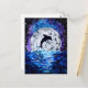 decorative watercolor artwork of a big moon in a colourful galaxy descending almost into the while a dolphin jumps out of the water up in the air.