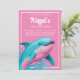 The invitation features a delightful illustration of a friendly dolphin in shades of pink and teal blue, leaping through sparkling waves. The combination of these refreshing colours evokes a sense of sunny days and cool waters, setting the perfect backdrop for a summer-themed birthday party.