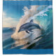 A dolphin plays and surfs on a huge rolling ocean wave.