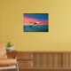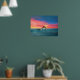 Poster featuring artwork of a playful dolphin pod swimming and leaping in the ocean under a beautiful beach sunset (original artwork KL Stock)