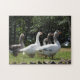 Five pretty and partially wild Domestic type geese taking a stroll at a park