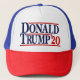 Buy a red white and blue Trump 2020 trucker cap and support Donald Trump for president! Featuring the words, Donald Trump in a bold blue text, '20 in red, centred on the front of the hat. Choose from different hat colours and get yours today.