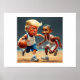 A caricature of Donald Trump in sportswear playing basketball with Barack Obama
