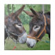 A pair of friendly brown grey donkeys with fluffy ears, touching noses with a background of grass and trees on a square tile.