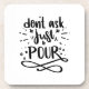 This set of funny quote coasters saying "Don't Ask Just Pour" is a great choice for a splash of the laughter in your home. Perfect gift for your family and friends.