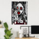 A black, white and red art pf a sick and scary person with red eyes and mouth with a building in the background. This is a AI generated art.