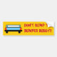 Yellow background with the back of a blue truck. Has the words "Don't bump the bumper buddy!!" Great for anyone that doesn't like other vehicles getting to close.