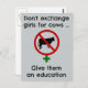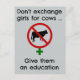 Don't Exchange Girls for Cows, Give Them Education. Our design was patterned after Kenya and Tanzania government posters bearing this message. In parts of rural Africa, cattle are exchanged for a young bride. This usually puts an end to the girl’s education. Opponents of this tradition believe that an educated girl will raise the standard of living for her family and community. This design is suitable for white and light-coloured backgrounds.