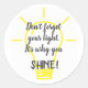 Don't forget your light. It's why you SHINE! Spread your positivity and inspirational wisdom with this awesome button. Purchase this uplifting, cheerful, and positive button to lift others' spirits while you wear it. Gift it to a friend, colleague, or family member to bring a smile to their face.