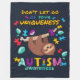 Autism Awareness support design with an encouraging message. Don't Let Go Of Your Uniqueness with bright vibrant puzzles and a sloth holding on to a tree branch